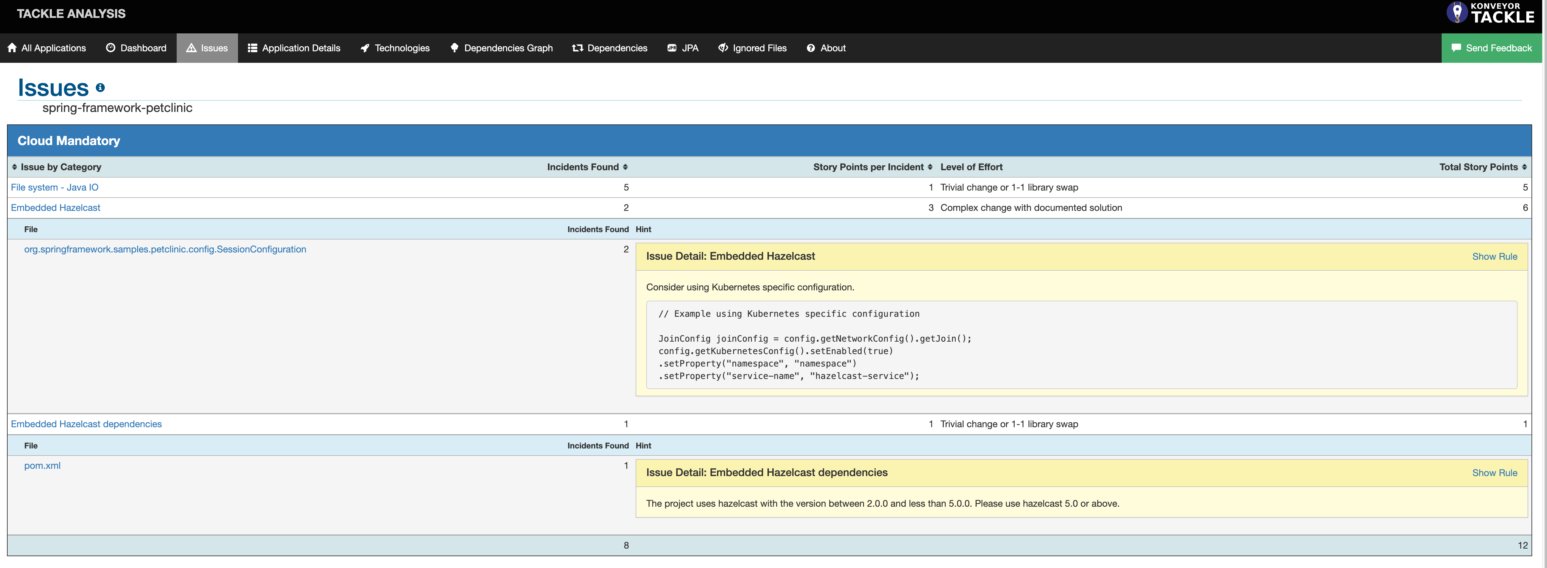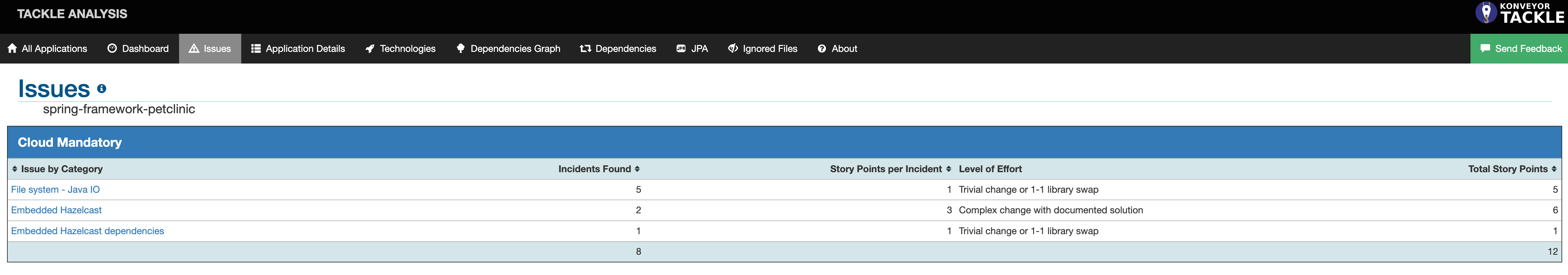 spring-framework-petclinichyperlink and a dashboard gets displayed. Navigate to theIssuestab where you can explore the issues. Pay attention to the ones that are categorized asCloud Mandatoryas they have to be addressed for a successful migration to Kubernetes.